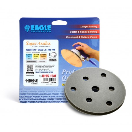 Super Assilex 5" Super-Tack discs with 7 hole vacuum assist in "Job-Pak" job size quantities for smaller jobs and convenience.